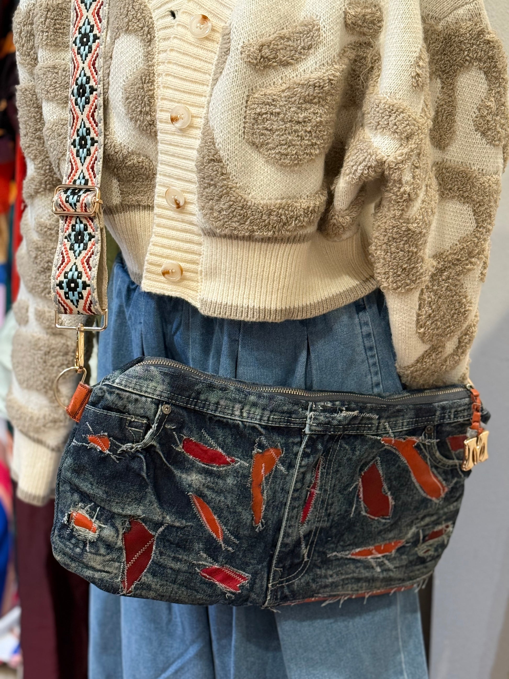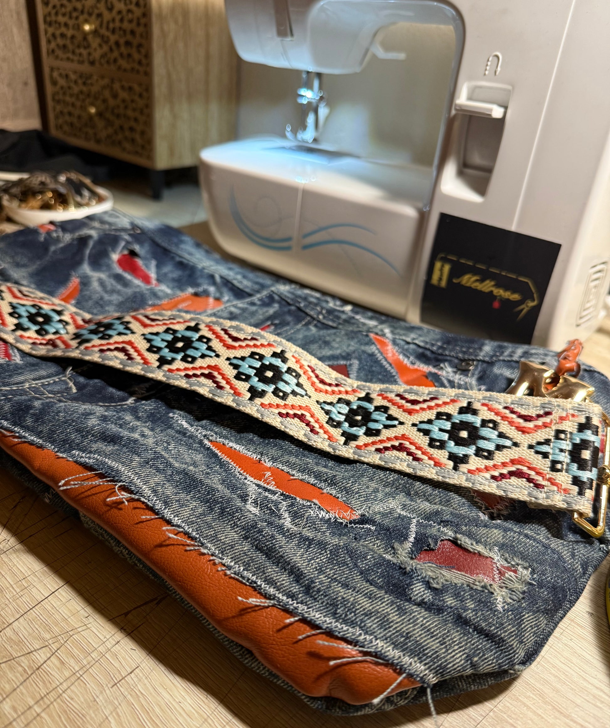 Our Uptown Denim Crossbody is a stylish blend of casual denim and timeless fall tones. Designed from sustainable dark-wash denim jeans, this bag features authentic pocket details paired with rich burgundy and cognac faux leather accents. The contrast stitching adds depth and character, while the crossbody style makes it perfect for everyday wear. This beauty has a interchangeable strap can also style it as an oversized clutch for an effortlessly chic look Beautifully crafted for the season, it captures the warm essence of autumn yet is versatile enough to carry year-round—because at MellRose, denim is always in season.