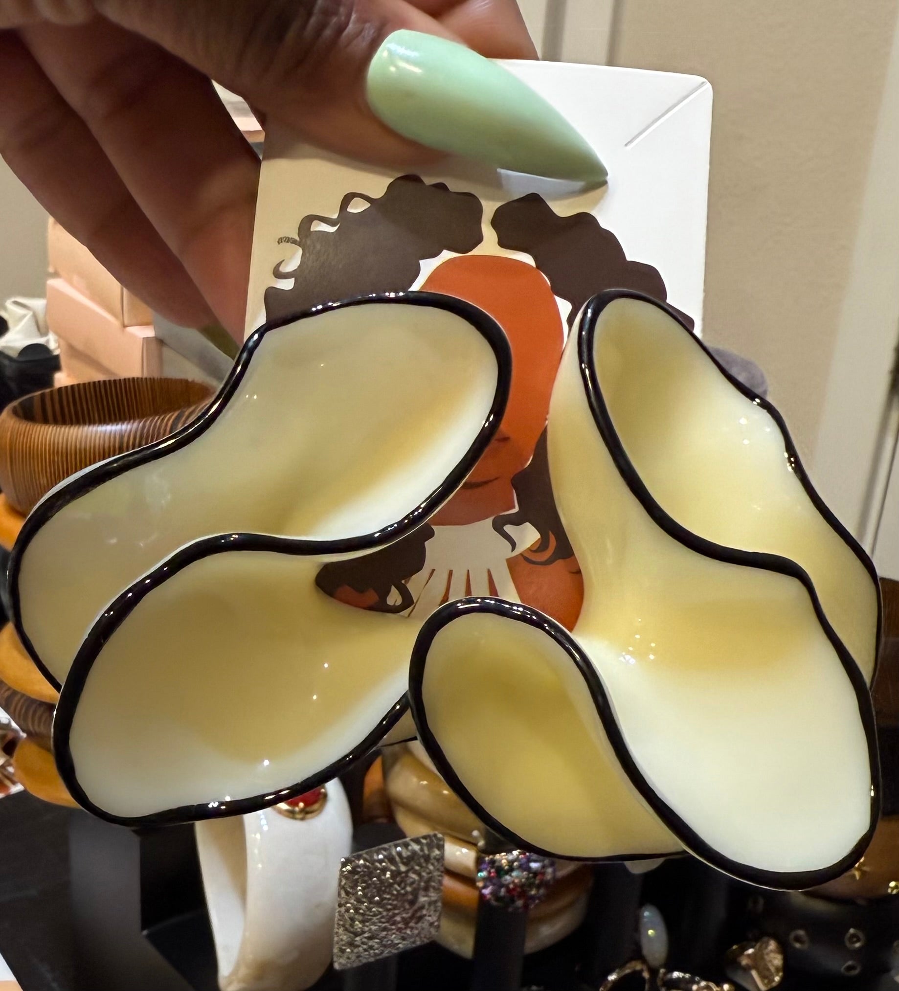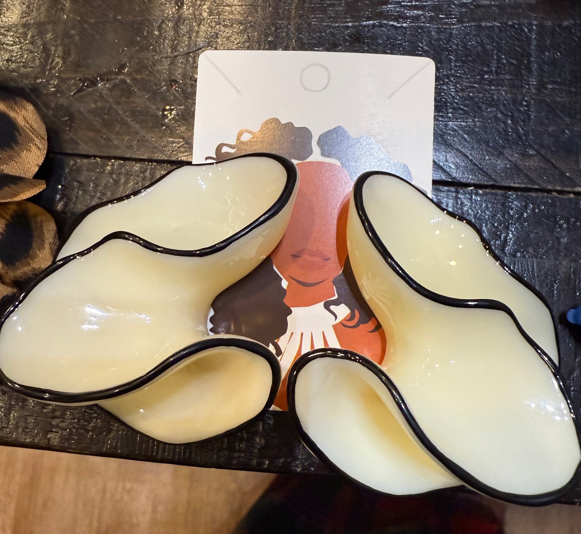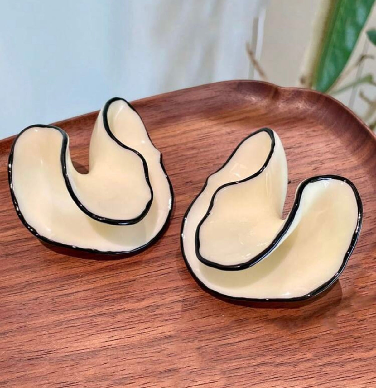 Turn heads with our Midnight Petal Statement Earrings a modern take on sculptural beauty. These oversized resin earrings feature a soft ivory hue edged with sleek black trim, creating a bold yet elegant contrast. The freeform floral design mimics natural petals in motion, adding artistic flair to any outfit. Lightweight yet impactful, they’re perfect for both casual chic and elevated evening looks.