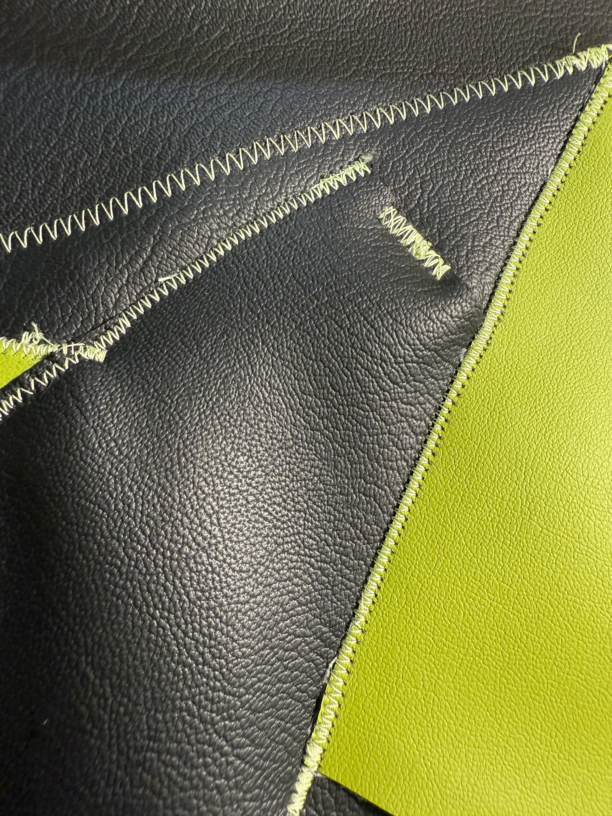 Turn heads with this oversized 18-inch zipper clutch, designed with striking black and green patchwork in luxe faux leather. The eye-catching stitch detailing adds texture and artistry, while the sleek black back keeps it versatile. Finished with a smooth black lining, this statement clutch is as bold as it is functional—perfect for day or night.