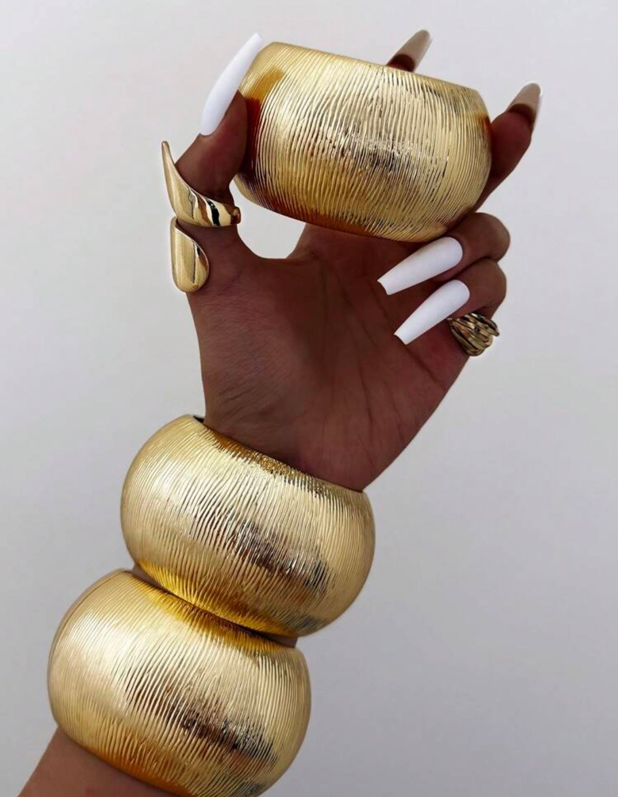 This statement bracelet features a wide, structured design with sleek ridges that exude strength and sophistication. Its striking silhouette is perfect for the modern trendsetter who isn’t afraid to stand out. Wear it solo for maximum impact or stack it for a high-fashion edge.