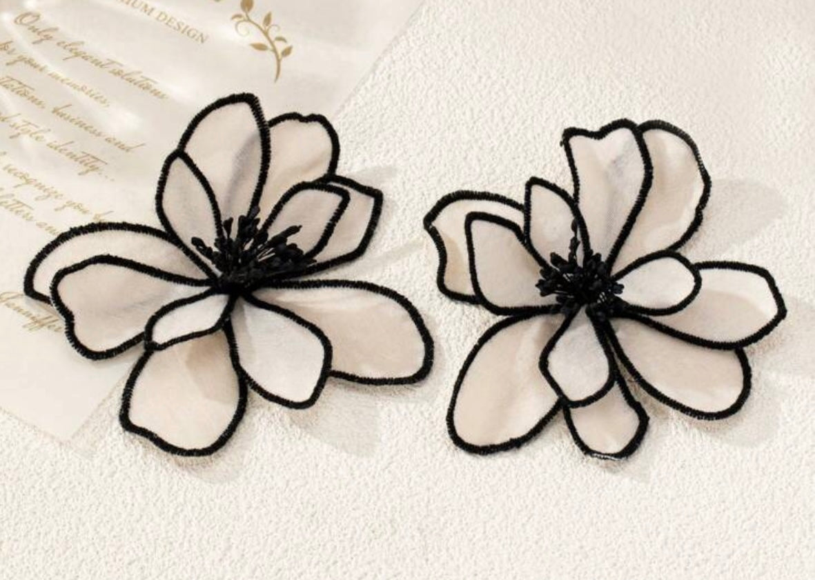 Tuxedo Chic Flower Earrings – A bold yet elegant statement. These lightweight fabric earrings bloom in crisp white with a striking black trim, creating the perfect black-tie inspired contrast. Effortlessly stylish and comfortable to wear, they add a touch of sophistication to both day and night looks.
