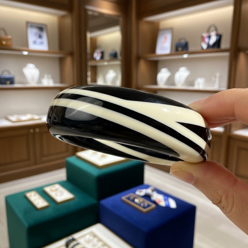 This vintage black-and-white bracelet is the perfect accessory to elevate any outfit. With its versatile color scheme, it can easily be paired with any color, making it a timeless addition to your jewelry collection. Add a touch of style and sophistication to your look with this beautiful vintage piece.